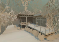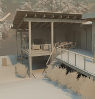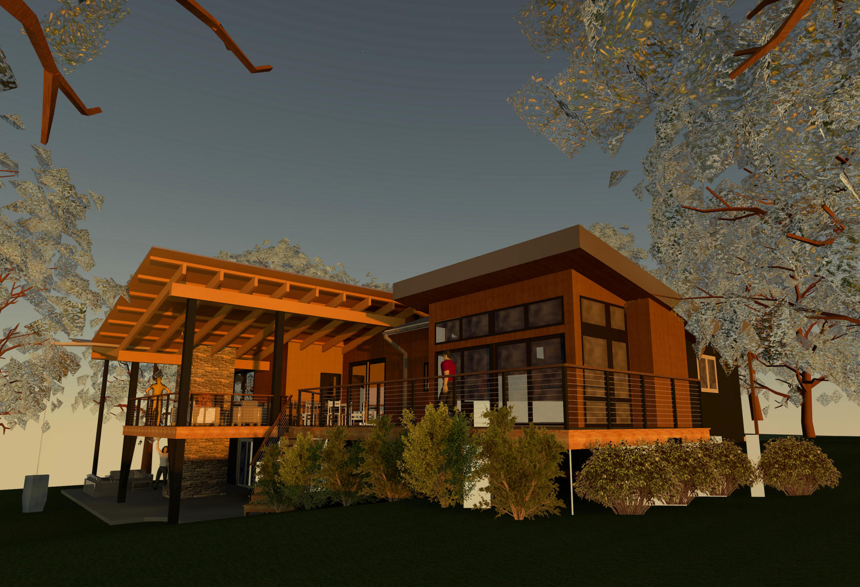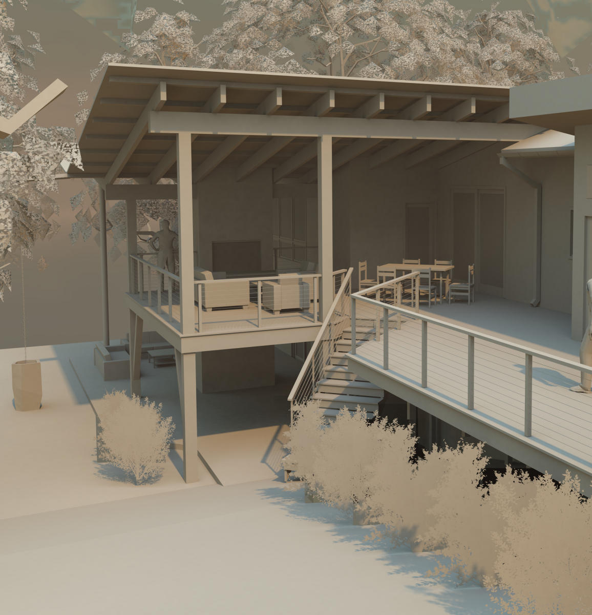 The clients wish to extend their covered living space to accommodate open-air gatherings without being fearful of frequent rain in this rainforest climate. The addition will "converse" with the existing forms to expand and consolidate deck area. The lower area off the gameroom also will be covered, and will include another fireplace - likely to benefit frequest guests with their own casual gathering area.